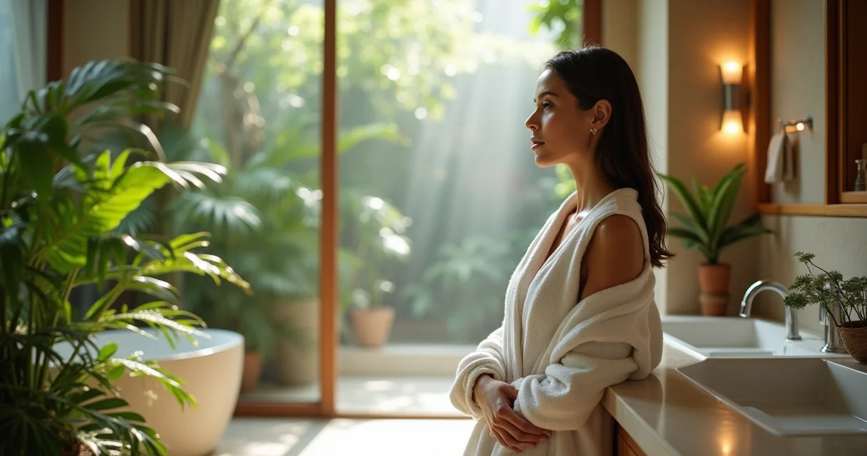 O banheiro deixa de ser um ambiente puramente utilitário e vira um espaço de conexão. A luz natural entra, as plantas respiram e você ganha um momento de pausa genuíno.
