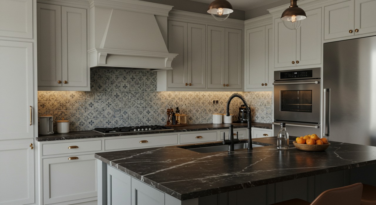 As bancadas são o coração da cozinha. Granito, quartzo e porcelanato são materiais muito utilizados por sua resistência e praticidade. Já os armários devem ser instalados nivelados e bem fixados, evitando problemas de alinhamento.