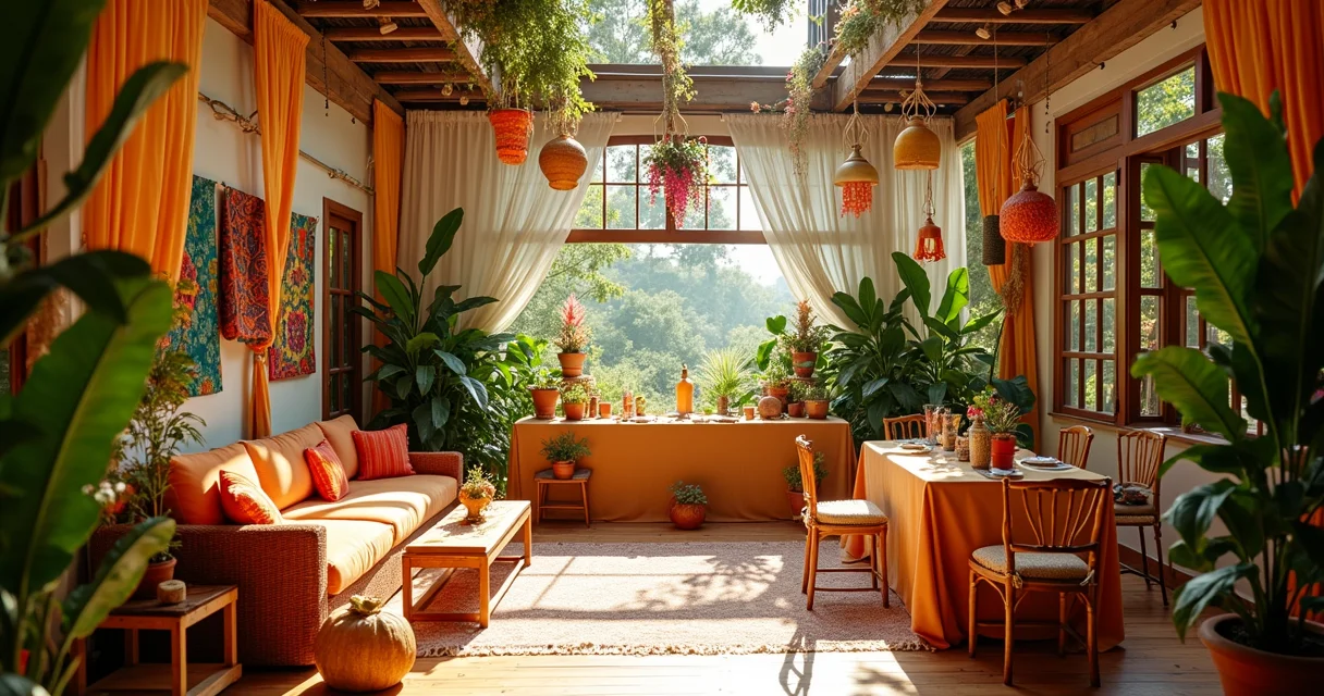 Boho Romântico e Livre: Mistura de texturas, tapetes estampados, almofadas coloridas e flores desconstruídas. É para quem não tem medo de ousar e quer um clima mais descontraído e cheio de personalidade.