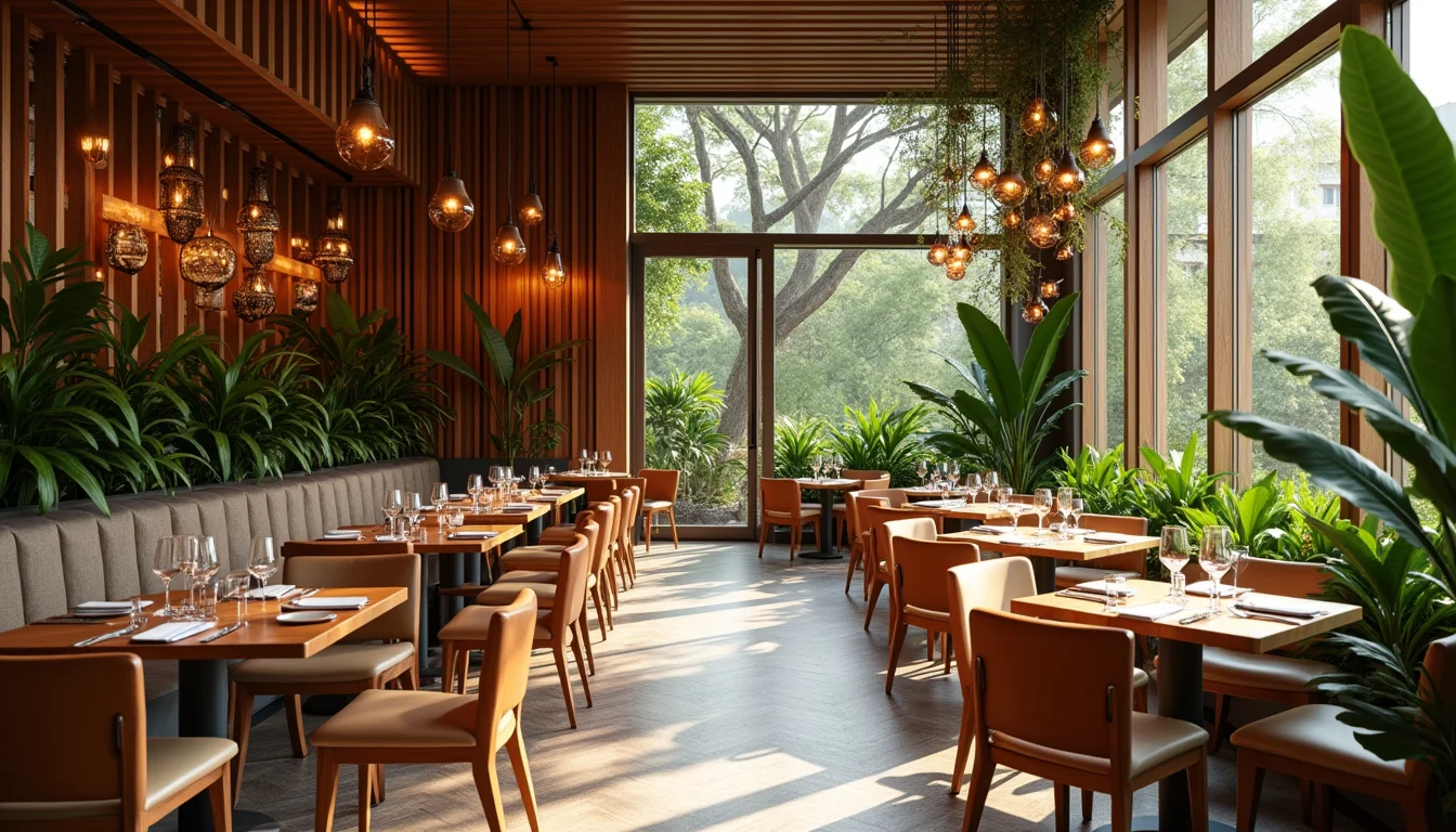 A paleta de cores neutras com toques de tons terrosos cria uma atmosfera acolhedora e elegante, ideal para salas de jantar modernas.