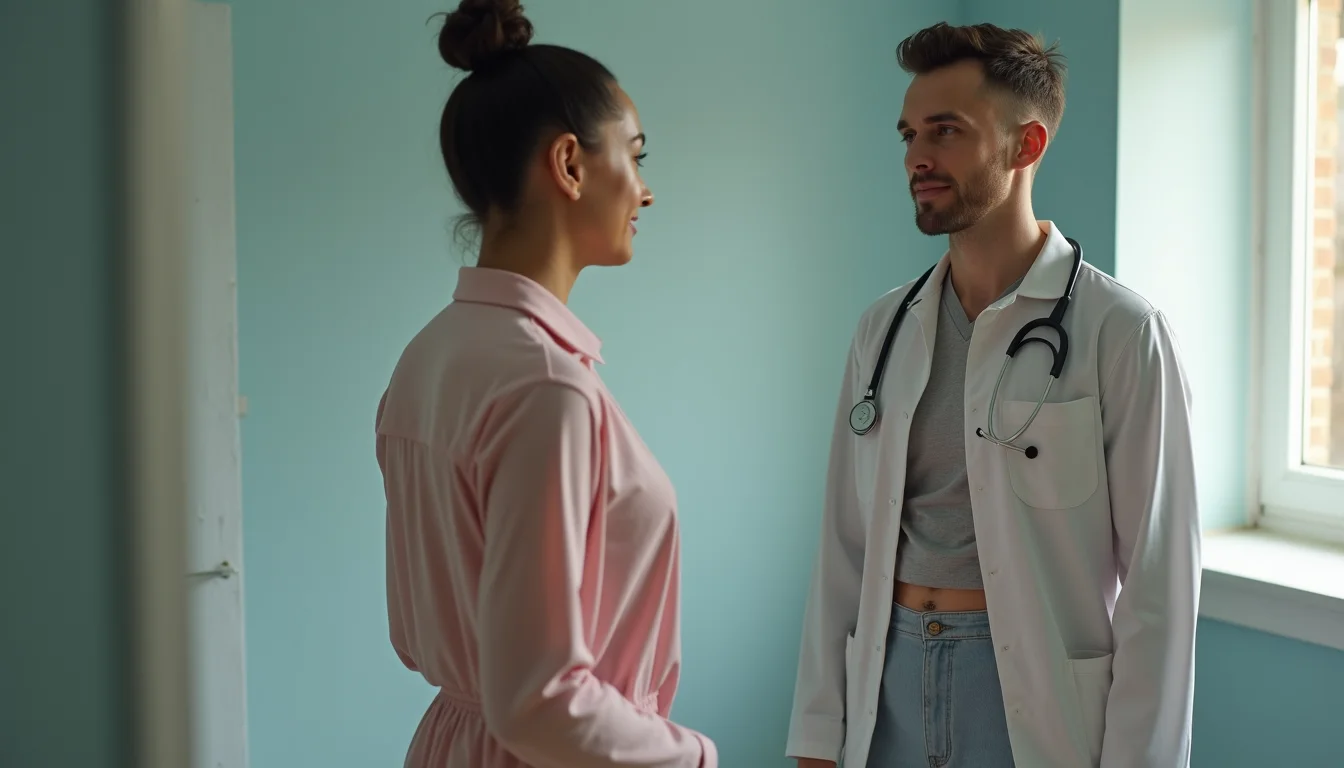 Ambiente de consultório com iluminação natural, onde uma fisioterapeuta veste um scrub rosa pastel, transmitindo calma e acolhimento, com a bancada de atendimento ao fundo.