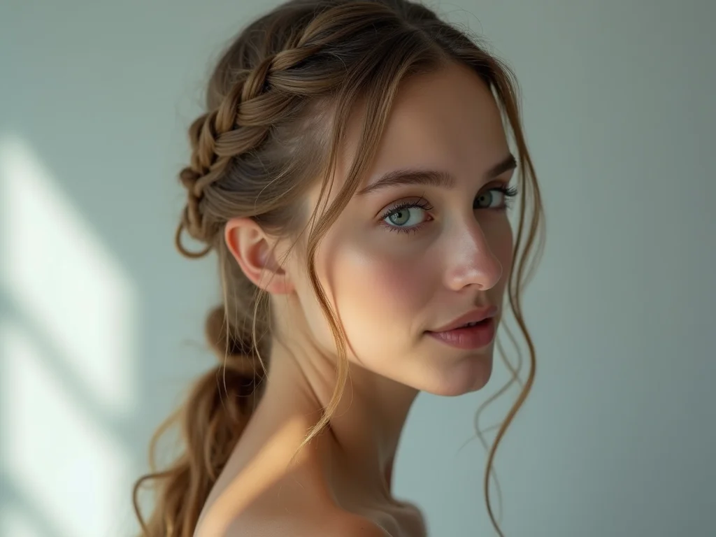 Penteado com trança embutida dupla e solta, em cabelo castanho claro com ondas suaves, com iluminação que realça o brilho dos fios.