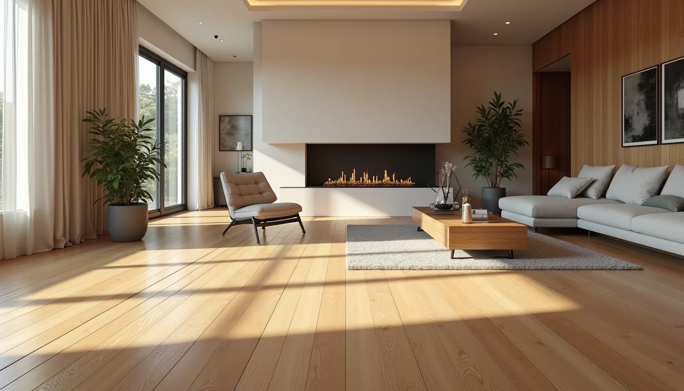 Sala de estar com piso vinílico amadeirado de tonalidade clara, apresentando veios sutis e textura fosca, combinando com sofá cinza e tapete bege em um ambiente com iluminação natural abundante.