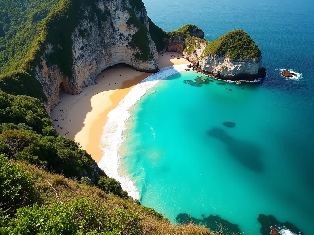 Essa praia tem uma vibe tranquila, sabe? A água é calma, quase uma piscina natural. Perfeito pra quem tá com a família ou só quer relaxar mesmo. O marzão ali é azulzão, e o que cerca tudo são essas montanhas que descem até a areia. É de tirar o fôlego.