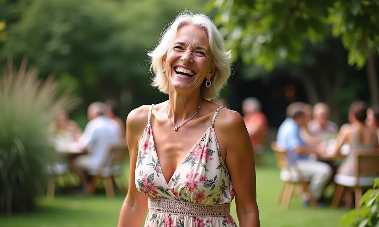 Mulher em vestido de algodão leve, aproveitando festa ao ar livre com toques brasileiros.